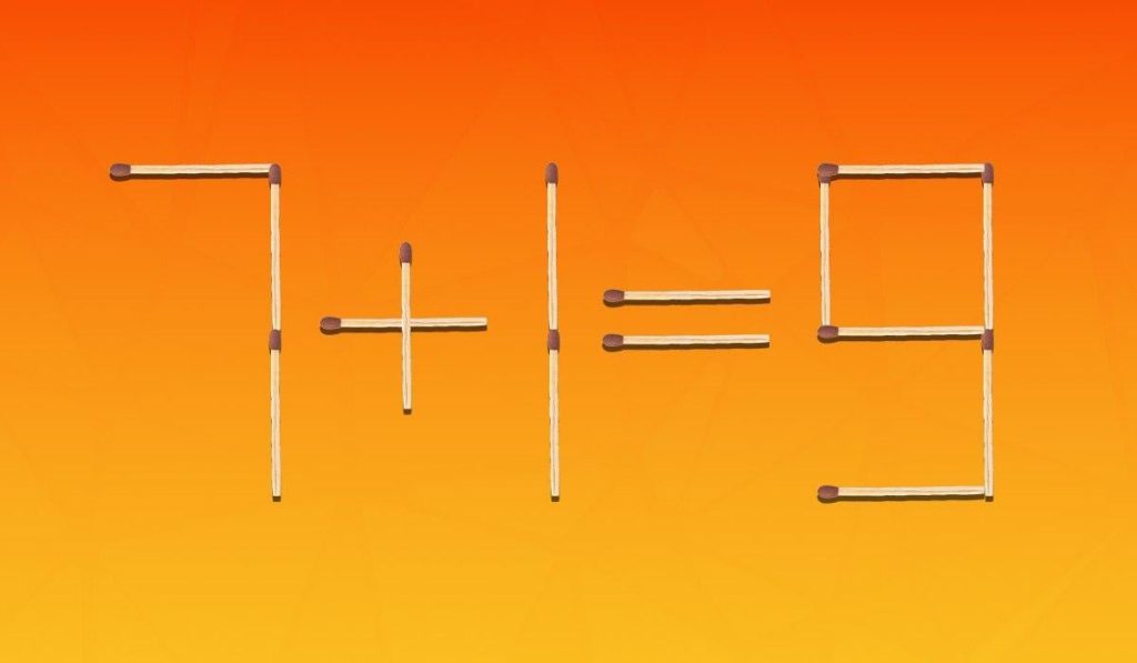 По-долу ще видите изображение, на което равенството 7+1=9 е разположено със съчми. Очевидно е, че то е математически невярно и трябва да го поправите, като преместите само две от 15-те съотвествия.