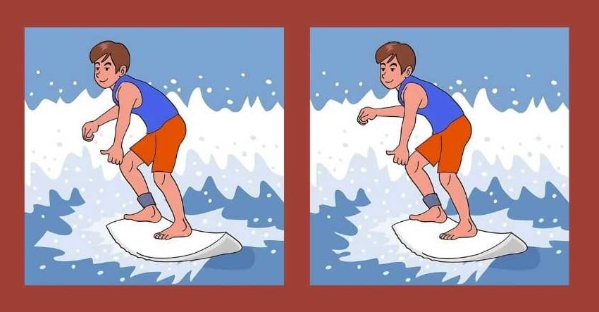 На снимката виждаме момче сърфист, което покорява вълните на дъска за сърф. На пръв поглед може да ви се стори, че момчетата на двете снимки са едни и същи, но ако се вгледате по-внимателно, ще стане ясно, че това не е така – някъде има няколко разлики, които правят снимките различни.