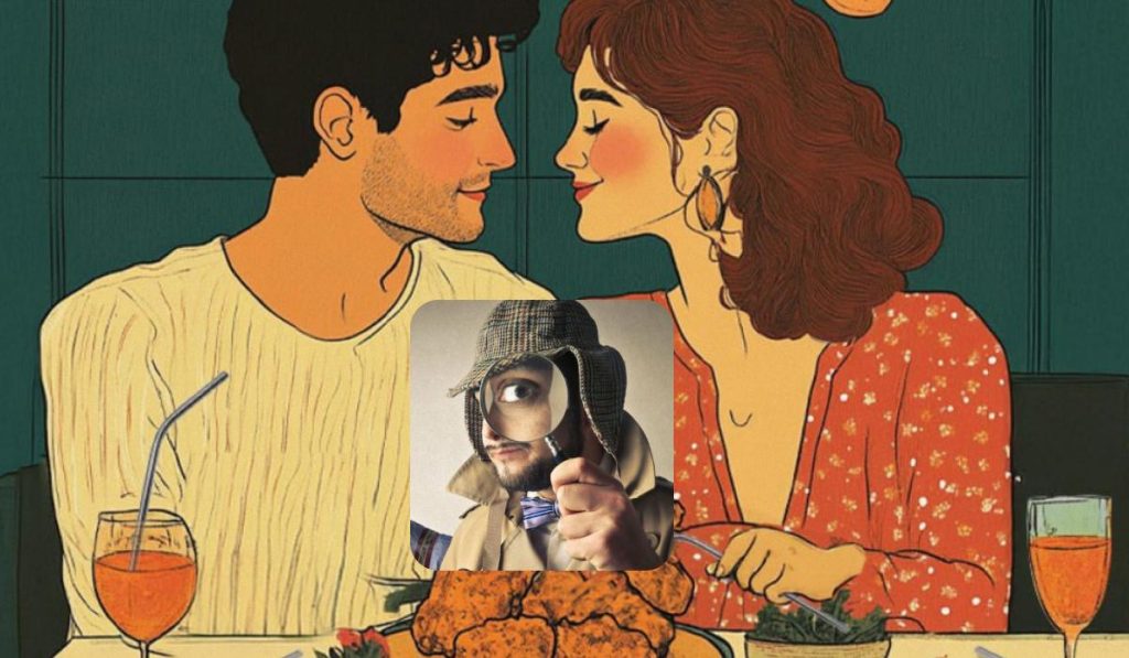Пред вас са влюбени мъж и жена, които разговарят приятно по време на романтична вечеря. Момичето е облечено в елегантна рокля, а мъжът – в лек пуловер. На масата се виждат чаши с напитки и няколко вкусни ястия. По стените на заведението има окачени картини, а от тавана висят електрически крушки.