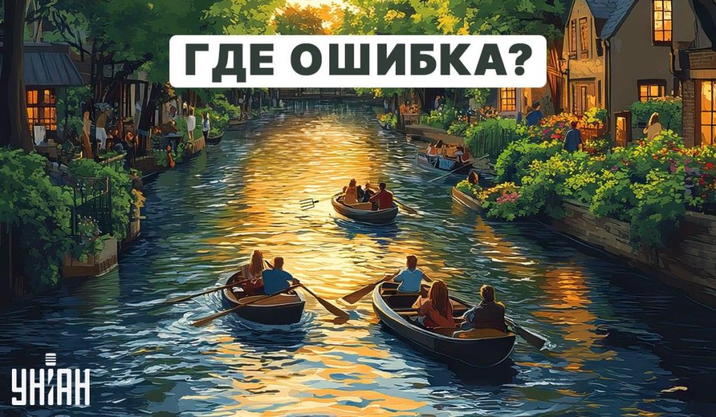 Пред вас има снимка, на която е изобразен красив пейзаж на вечерен град. Между къщите тече река, по която плуват хора в лодки. На пръв поглед изображението изглежда нормално, но в действителност в него има груба грешка.